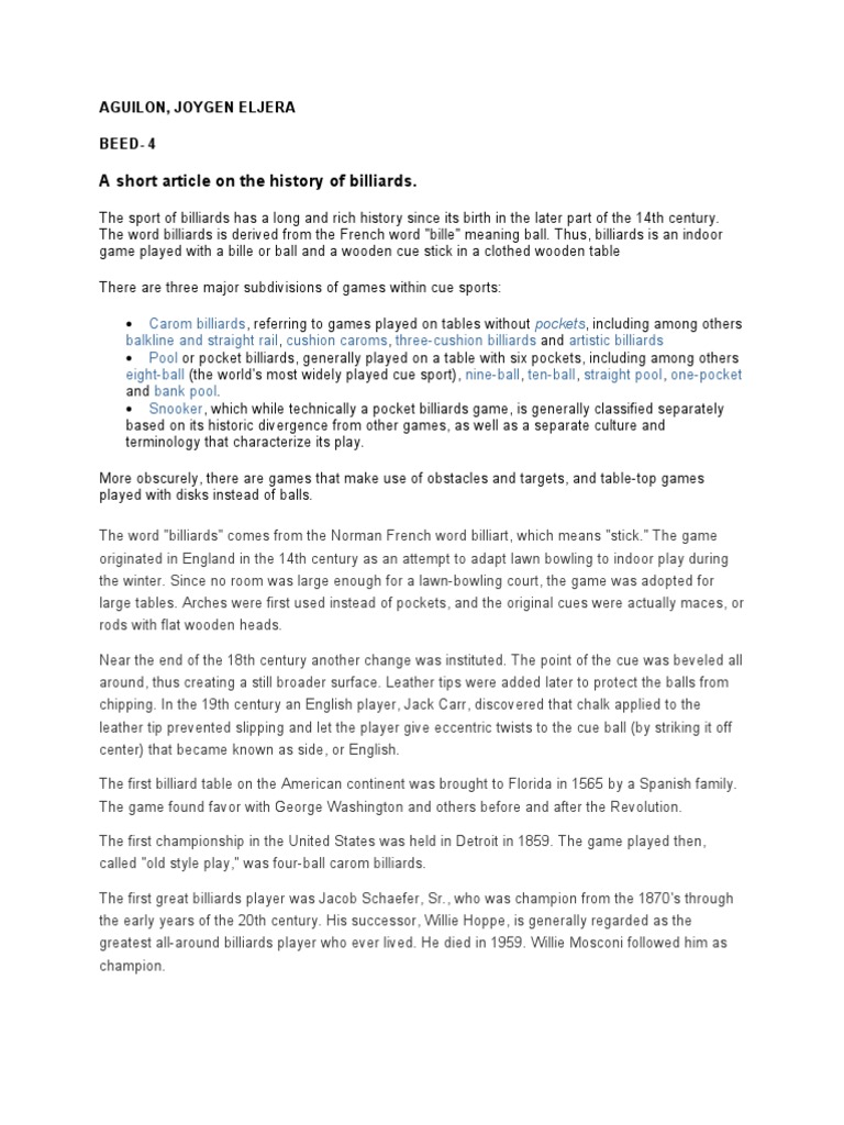 A Brief History of the Sport of Billiards from its Origins in the 14th